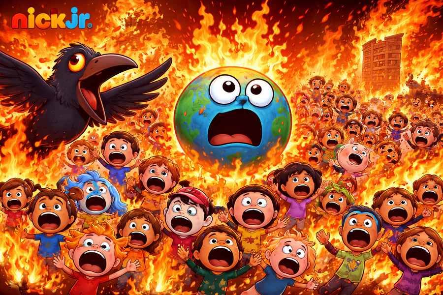 fire earth crow screaming scene the end of Nick jr on vyond legacy city voices goanimate sounds effects crowd panic man and woman screaming sound effects
