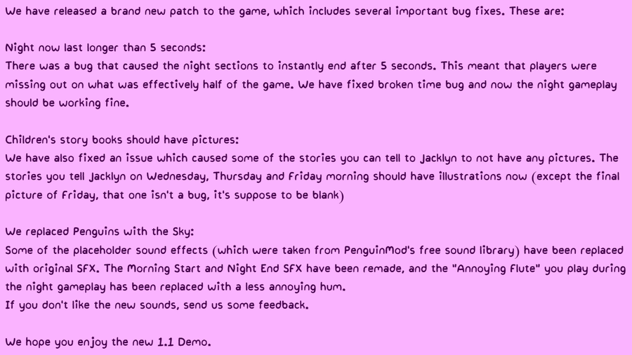 We destroyed a lot of bugs we found in the game, mostly to do with the key binds in the night section.