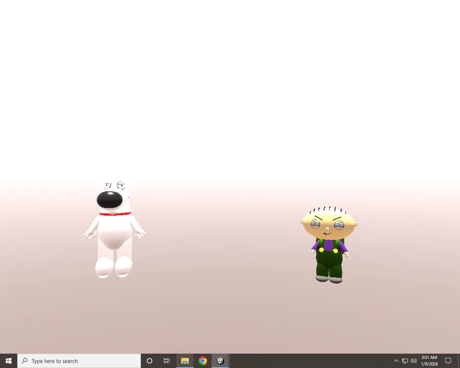 lol idk if thats right, i have stewie with some animations able to jump n stuff ,able to run around the top floor right now ...