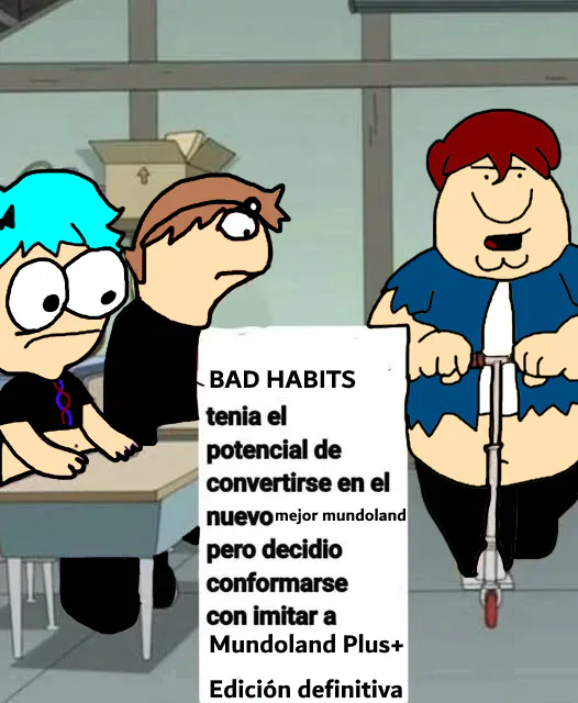He llegado a la conclusión de que cancelaré la parte 2 porque me gustaría empezar Mundoland 3 en cuanto antes como proyecto principal porque es el que más disfruto de hacer, no se confundan, Mundoland Bad Habits me encanta como proyecto y pienso que es de los que tiene mejor historia hasta ahora de todos los proyectos que he sacado pero si hago la parte 2 me llevaría mucho más años de desarrollo y sinceramente no creo que pueda rentar así que he decidido convertir la parte 1 en un juego único creando así Mundoland Bad Habits edición definitiva.