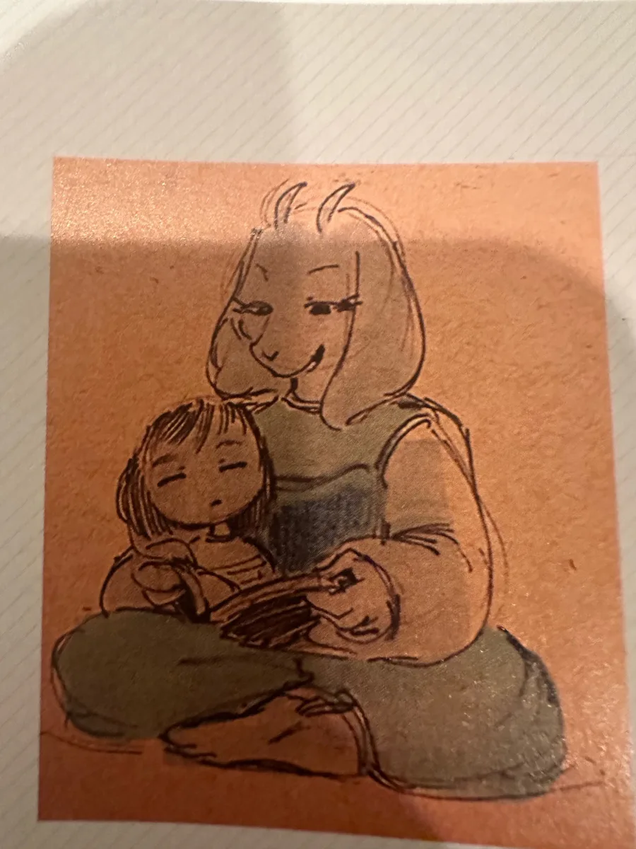 When I got the undertale art book for Christmas in 2024, I drew a lot of designs from it. One of them was an image of frisk sitting in toriels lap.