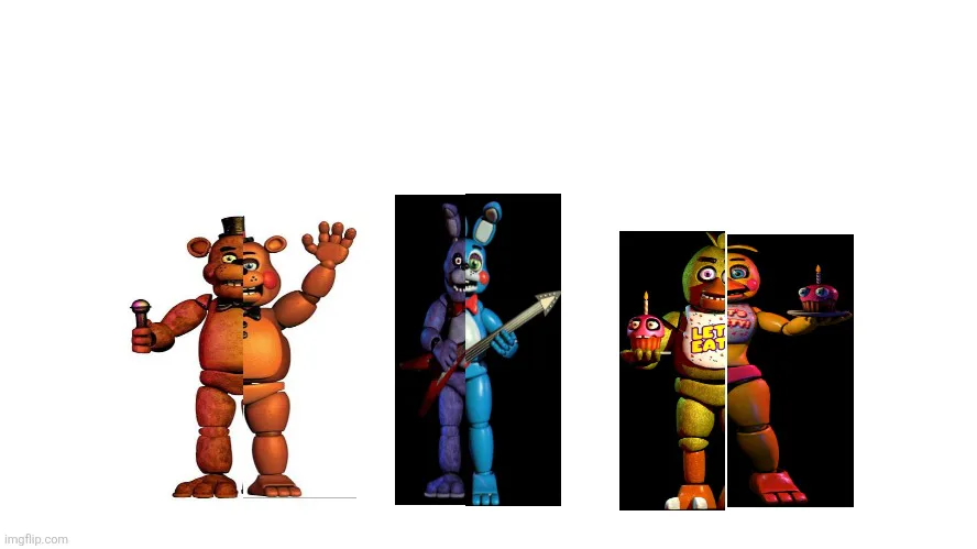 I had a dream last night where I was playing fnaf 1 irl but the classic animatronics were fused with the toys and it looked like this