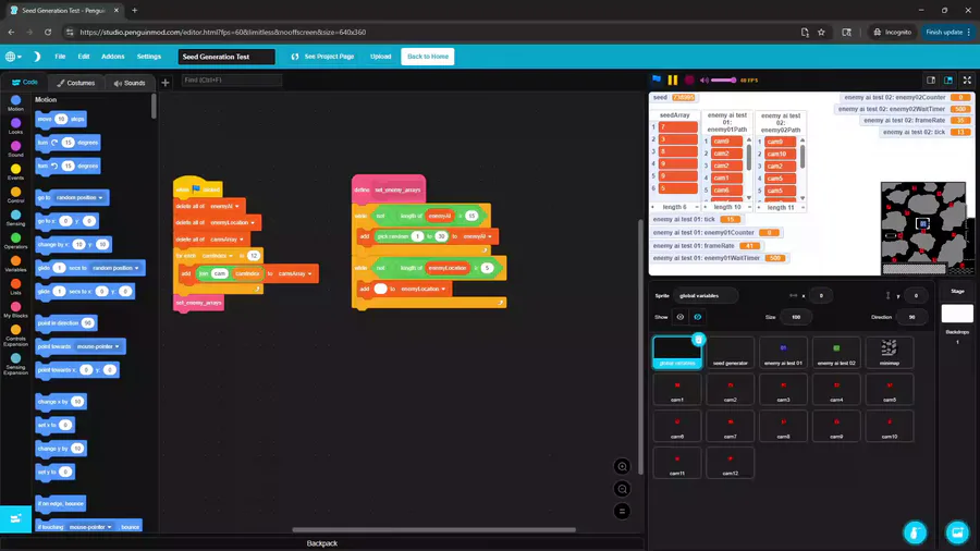 Testing out a random seed generator I programed in PenguinMod. The seed affects in gameplay in a form (such as randomizing an enemy's path, like in the video attached). Thinking about implementing this in a future game.