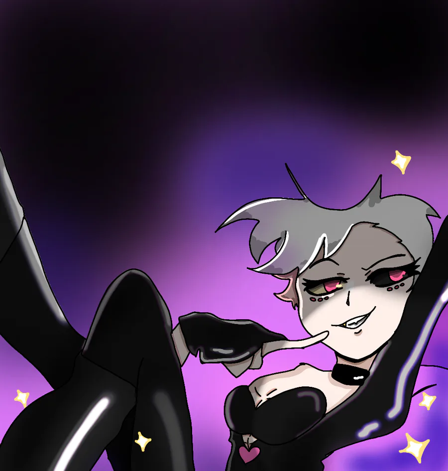 Cyn is considering whether it's better to eat everyone or to blow up the whole chopper planet. Trying to do more digital art, but honestly, I'm too busy with coding. I will be releasing the Murder Drones log in the near future, #Cyn #MurderDrones, tired,