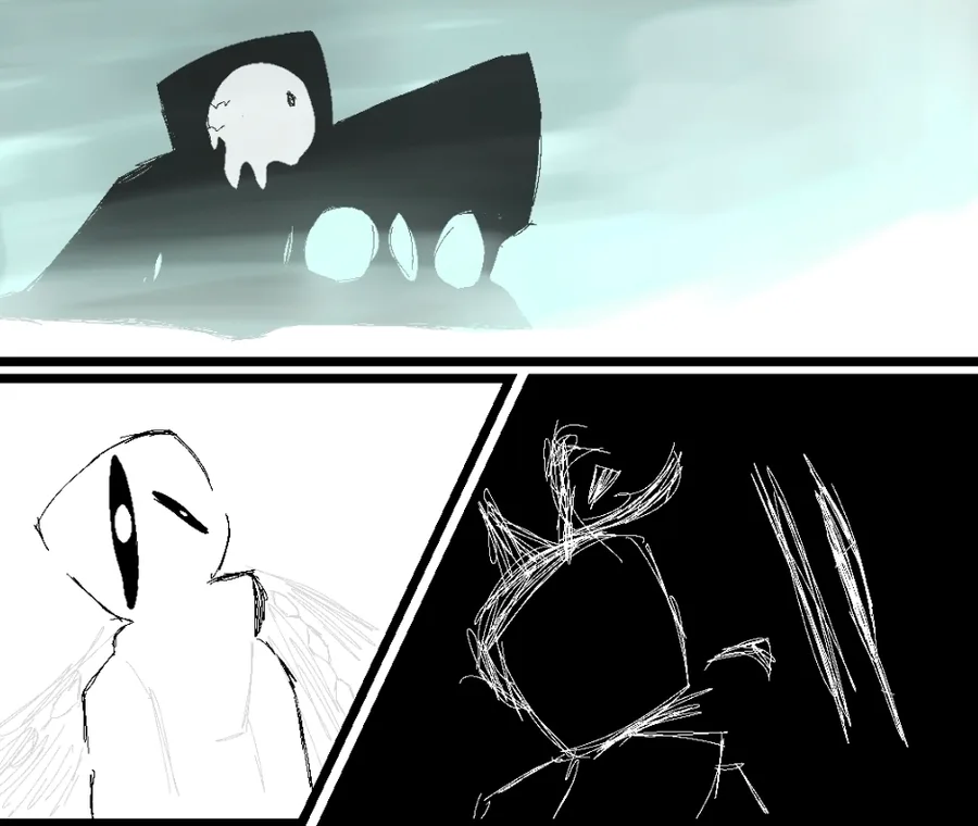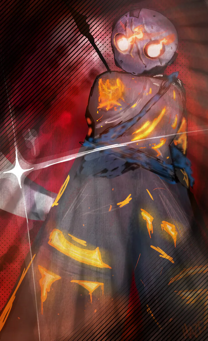 A few hours later, she woke up, suddenly able to see again, but it was blurry. She was greeted by a figure with a similar malice to the one she'd seen before in his hand, but a navy blue instead of pitch black. It was in the shape of a mask, and the figure reached out his other hand to help her up. As soon as she touched her hand, her vision became clear and she stopped hurting.