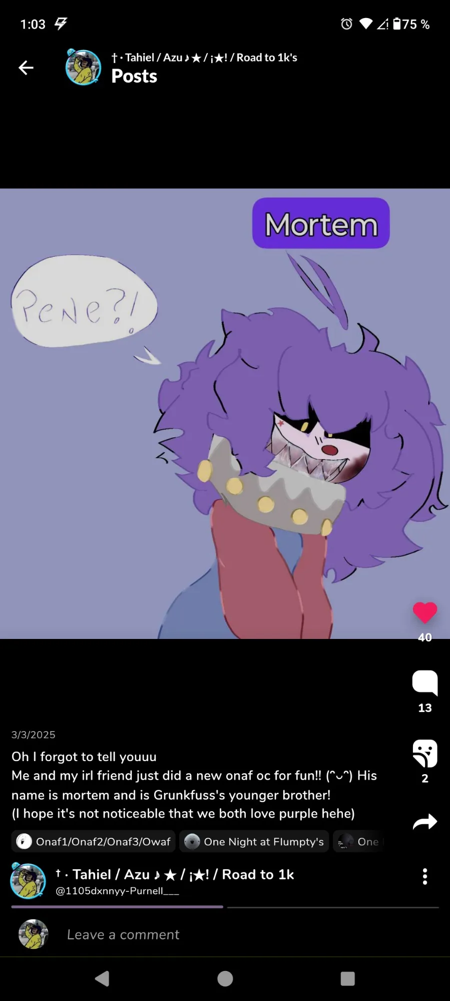 I forgot to tell yall, my irl friend quitted onaf fandom a long while ago, so now mortem is apparently mine now so uhhh... Meow??