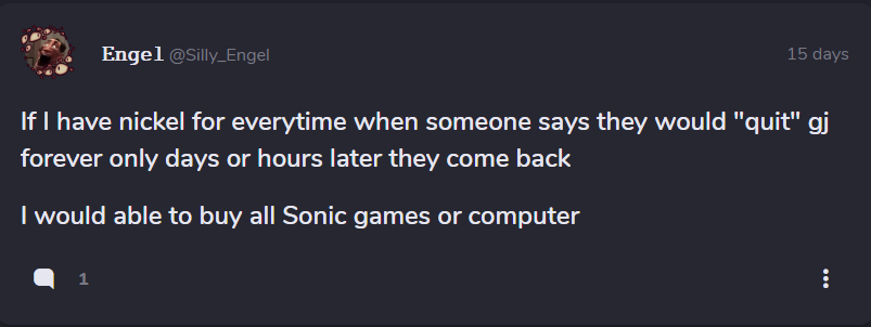 Bold of you to talk about sum "If I have a nickel for every time says they would "quit" gj forever only a days or hours later they come back I'd be able to buy all Sonic games".