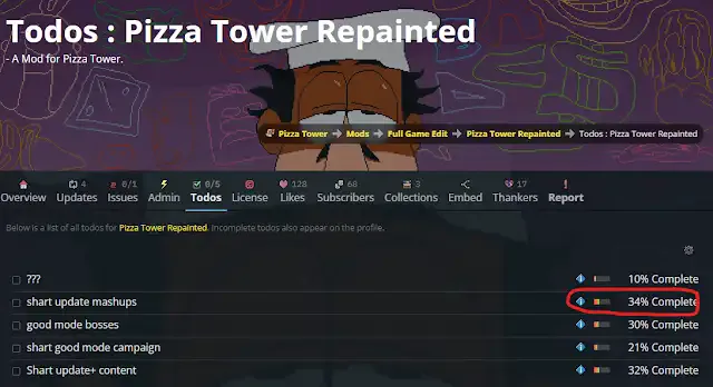 и почему тут готова на 34%, если я сам давно выпускал видео мэшапы который принадлежит для этого мода игры Башни Пиццы Repainted. Это вообще 100% и мне хочется чтоб это модем использовали мои мэшапы!