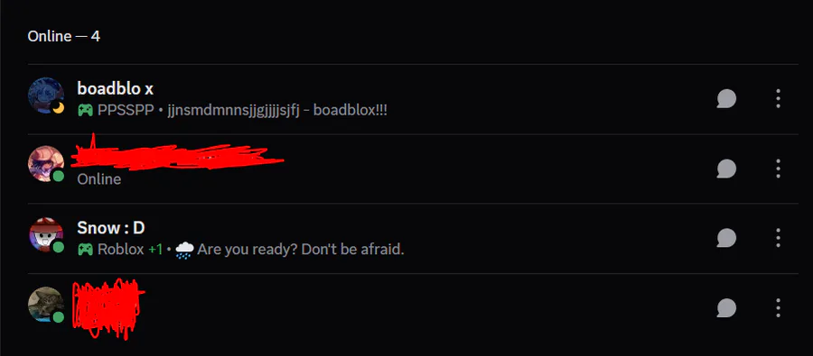 literally only 4 of my friends areeeeee Online and i think its clear they dont want to talk considering theyve left me on read on multiple messages red stuff is Censoring to hide their username since its the same