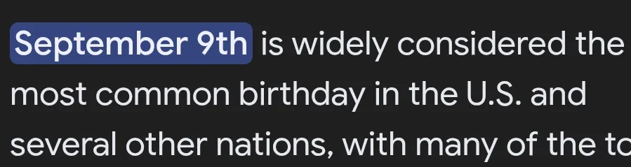 September ninth is widely considered the most common birthday, though mainly in the U.S., meaning that many parents fuck in December.😸