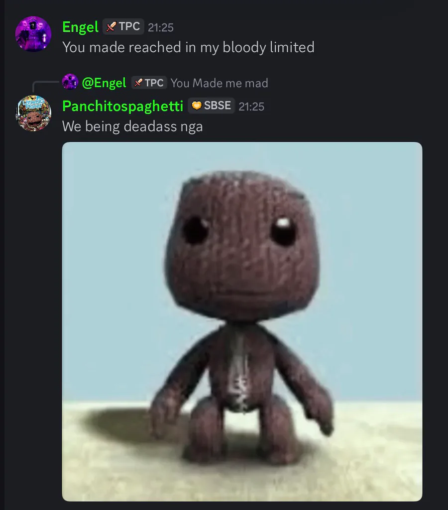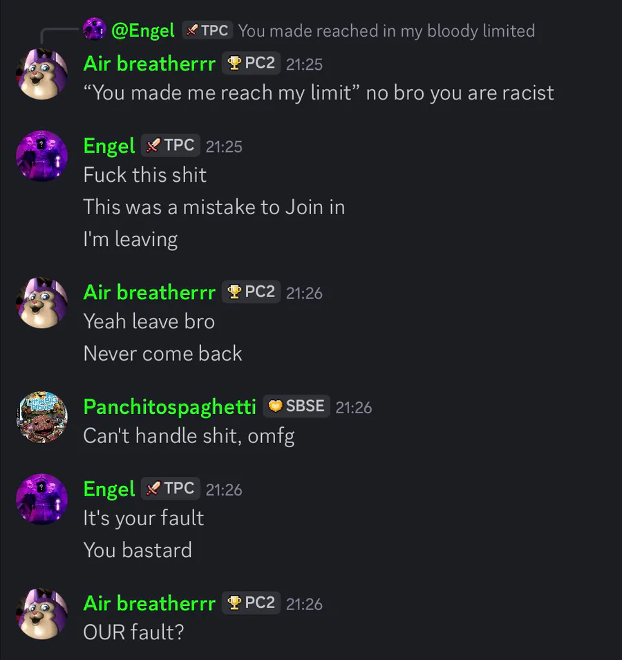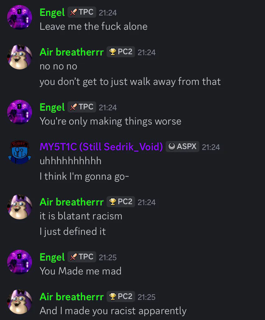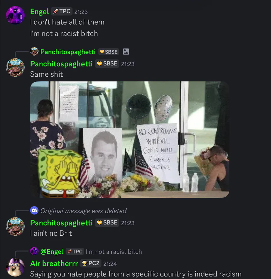 Basically Engel said “fuck you brit” and has been saying it in the server for a while, it was the deleted message that sedrik replied to. Then he left the server afterwards