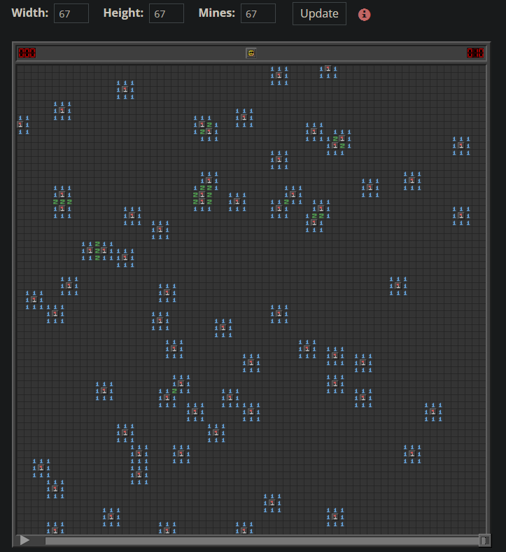 67x67 with 67 mines. wonderful first post am i right