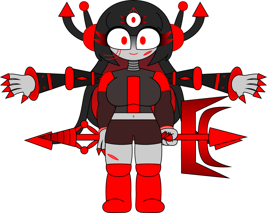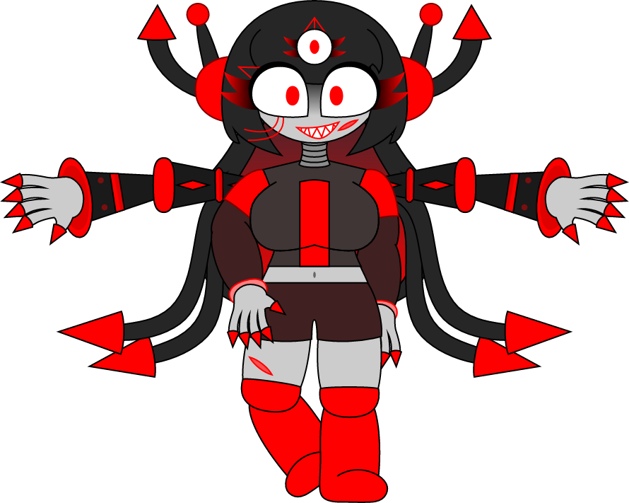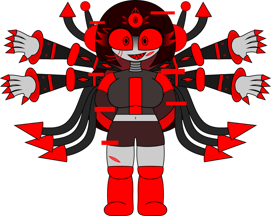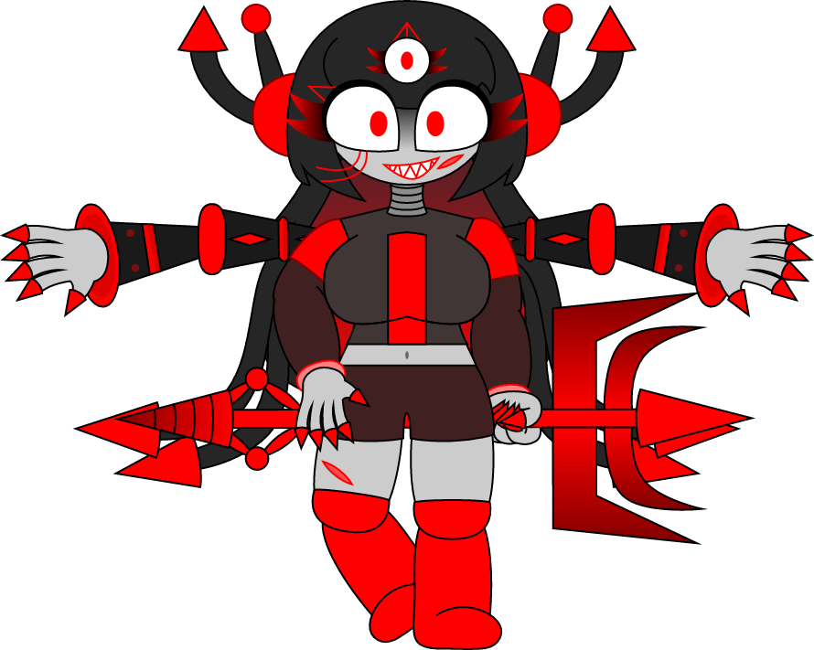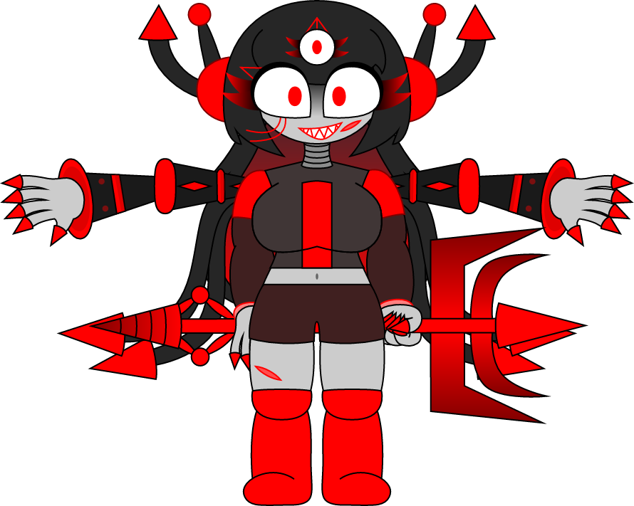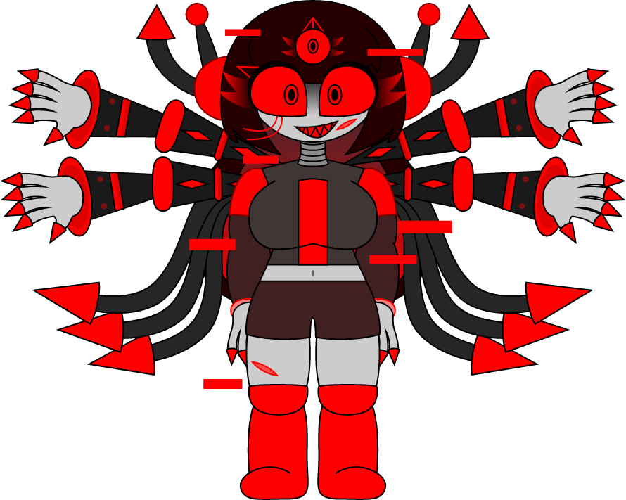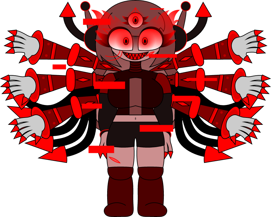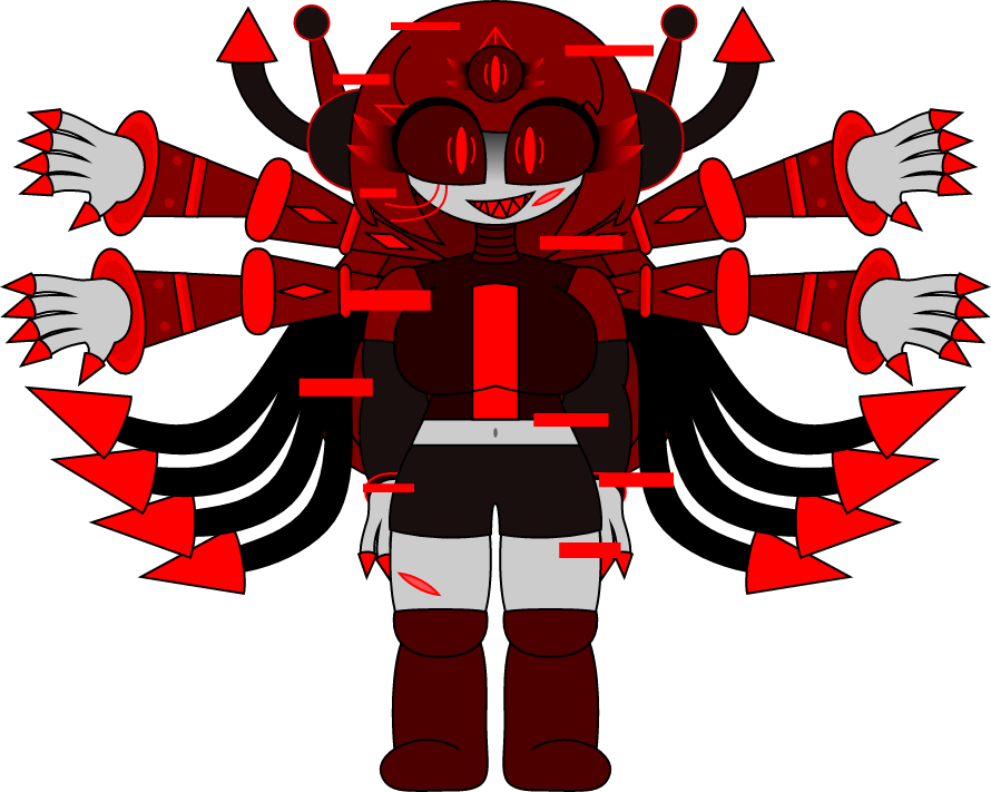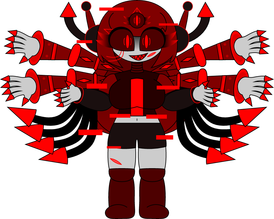 Red spikes, phobos gaster blasters, red and black polygons, extra arms, fire balls, red stars, crimson flowers and laser eyes.