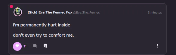 Hey Eva...I WANT to comfort you because you deserve it. You are one of my peak friends and I'm not just gonna let you go like this...if you need to vent, DM to me. I'd love to help you, always. :<