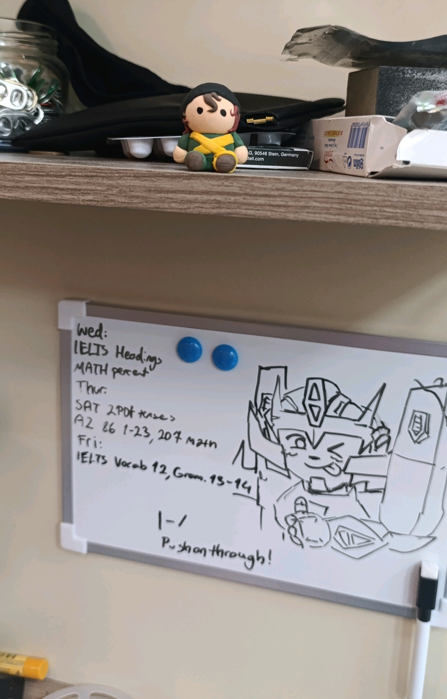 idontwanna do my.hoemwork but the little rodimus doodle on my whiteboard and my emotional support torchbearer are watching me