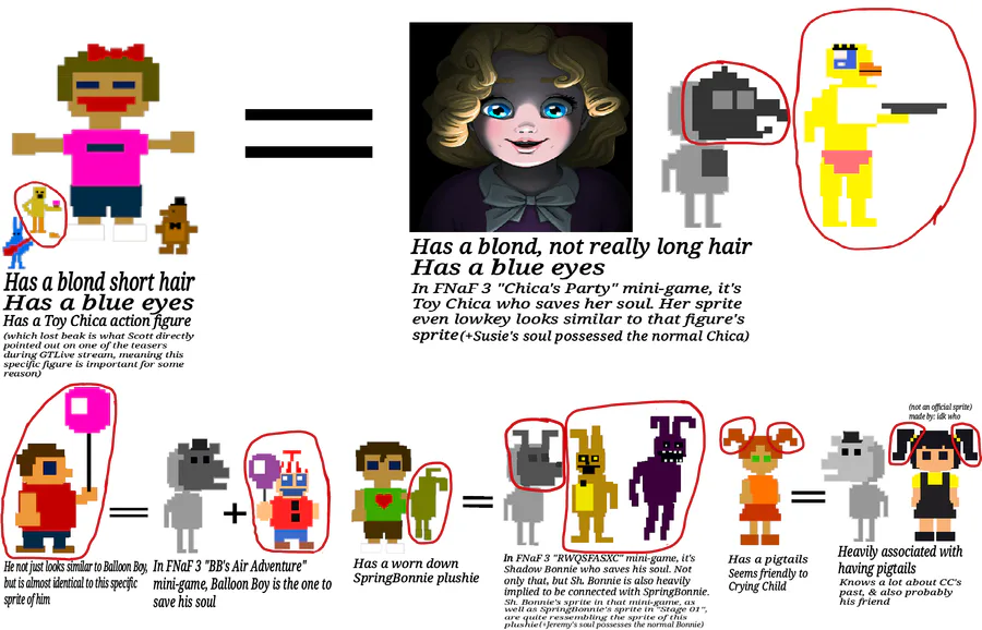 What if the kids we see in FNaF 4 are actually the MCI kids, with pigtail girl being Cassidy/Golden Freddy, boy with balloon being Gabriel/Freddy, kid with Plushtrap being Jeremy/Bonnie, & girl with action figures being Susie/Chica?