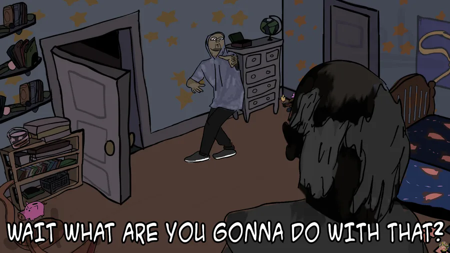 wait what are you gonna do with that? get back! ow... i think that something cracked! and then i woke up in a diffrent room sweatin and confused did she hit me cause im feelin and i bet she left a bruise dude this lady crazy and i gotta escape