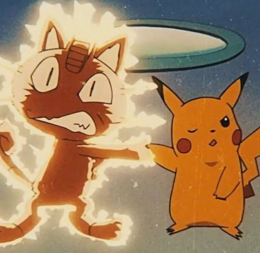 Meowth got electricity to zap him then he found a Pokemon card and stole it