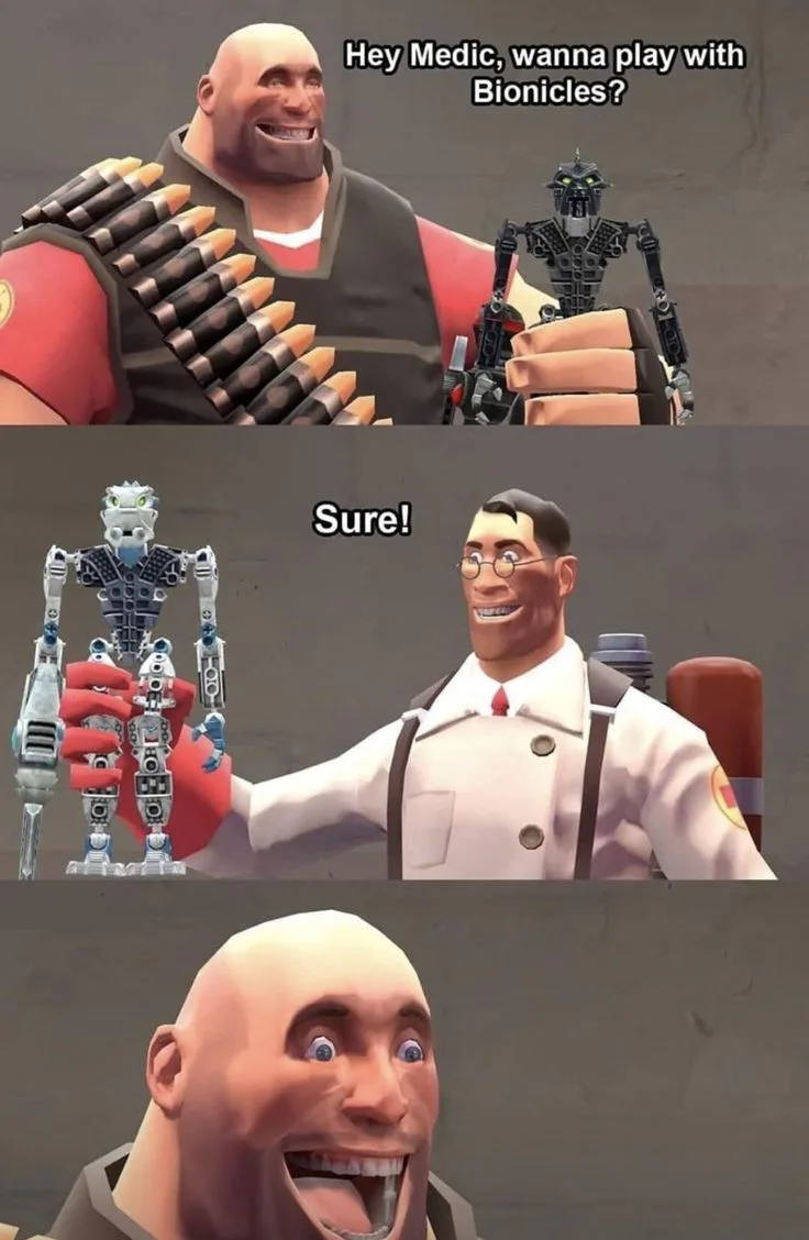 Medic plays with Bionicles with Heavy
