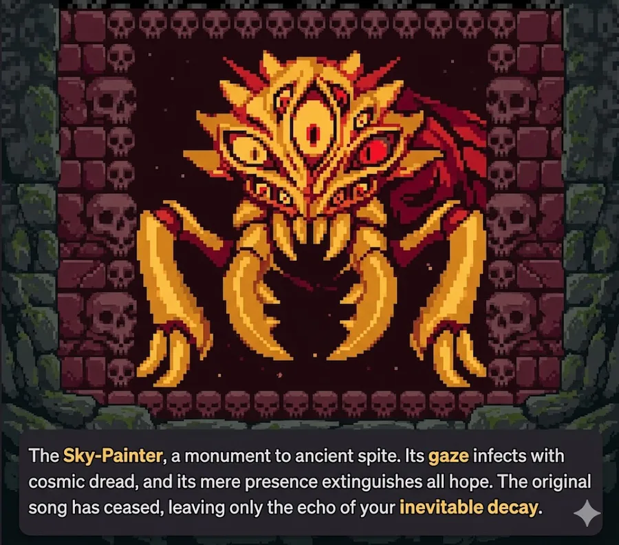 The Sky-Painter, a monument to ancient spite. Its gaze infects with cosmic dread, and its mere presence extinguishes all hope. The original song has ceased,leaving only the echo of your inevitable decay#GameJolt #RetroRPG #IndieGame #ThoughtAndCreation
