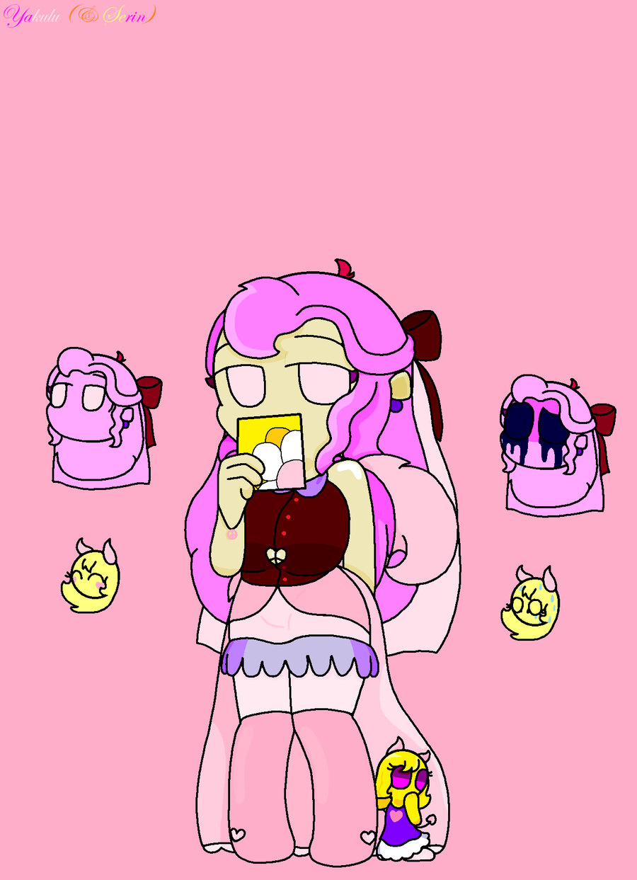 Yakulu* A youngest sister of Yomagi and daughter of Lennox and Lychea. She kind of is the most pink in her family and she adopted a (sunshine dandelion) blonde baby demon; Serin after finding out through a letter that one of her parents has a worsened condition. Yakulu writes cards for people, which is why she's called "the Empress of Cards".