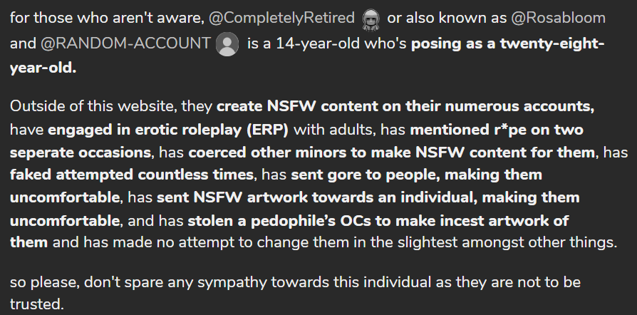 https://discord.com/channels/1379568335343325275/137956833671066… go to the link in the message and report the stalker. He's stalking a 14 years old kid and accusing him. He (the victim), seems like an innocent, although he draws gore (like me). Please report the stalker.