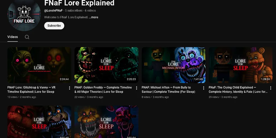 This FNAF channel needs to be called out. It uses AI images, has a TTS voice narrating, has a description that is clearlly written by AI, and probably uses AI for scripts too. This channel is not popular, but still. (I don't support harrassment though.)