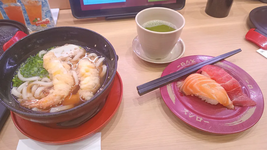 Having lunch with sushi and udon