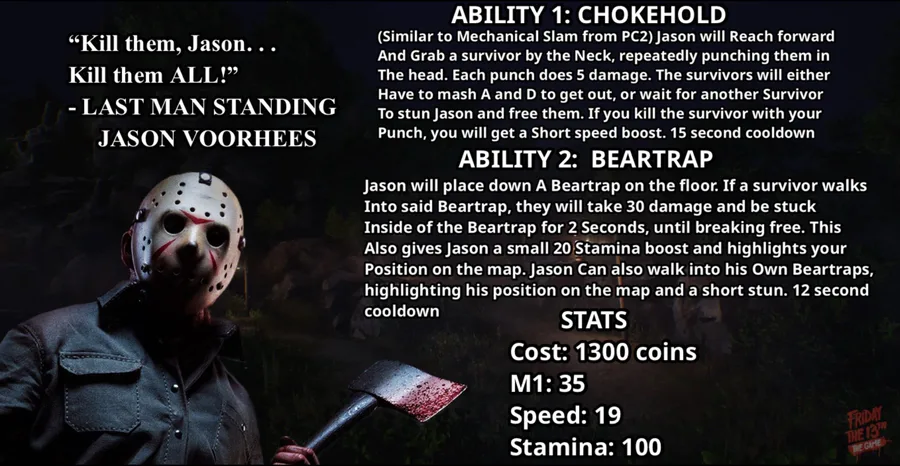 Jason has no voicelines, but instead, the ghost of Pamela voorhees will Say a line When killing a survivor, LMS starting, or getting stunned. Examples include: “you CANT let them escape, Jason!” “Mother knows Best.” “Show them NO mercy.” (When idle) “Kill them, Jason! Kill them ALL!” “THATS my boy…” “Don’t let the Rest run away.” (Killing a survivor) “Just one more, Jason.” “It’s almost over!” “What a fun spree this has been.” (LMS start) “Show them Less Mercy.” (Stunned)