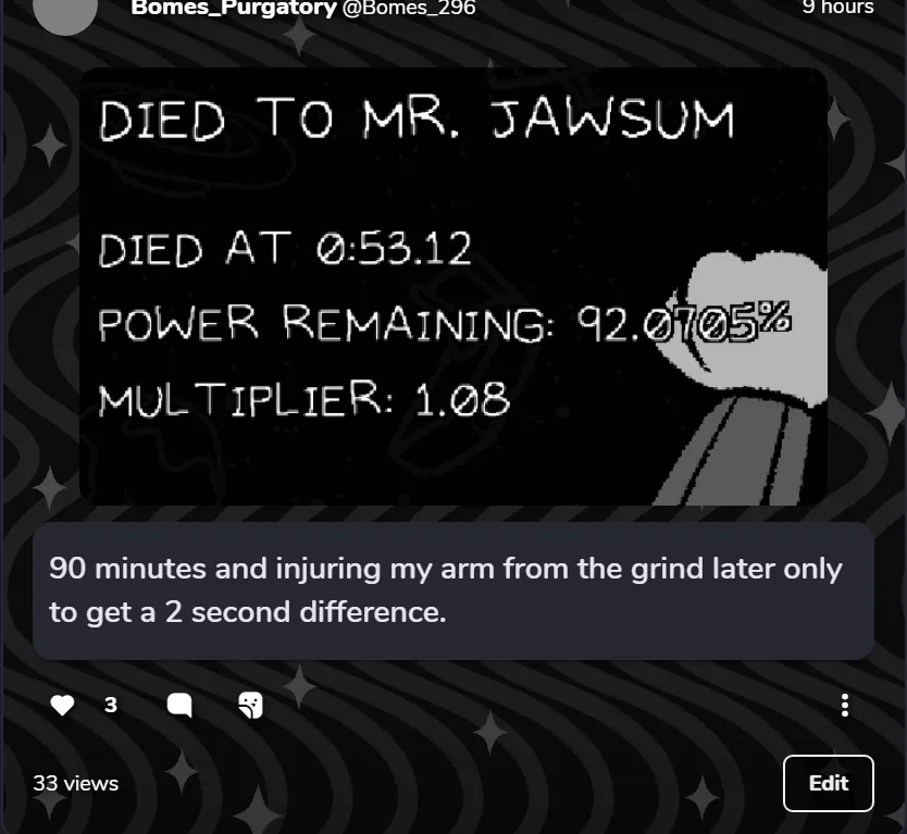 90 minutes and injuring my arm from the grind later only to get a 2 second difference.