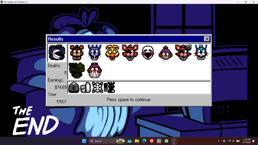 ...Just for it to pick Animdude, so I reluctantly invited Nightmare BB, who surprisingly wasn't a nuisance since I used the cameras VERY sparingly, allowing me to finish Night 5 first try, and get the Slacker Ending.