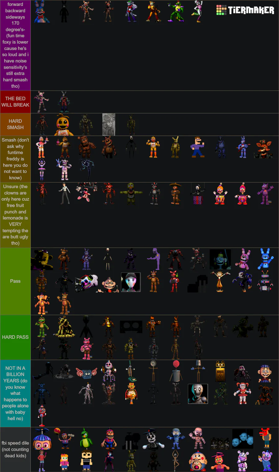 my fnaf smash or pass and the reason im probably getting thrown into an asylum in the future (btw mystic hippo and glitch trap are hard smash and carny is a smash)