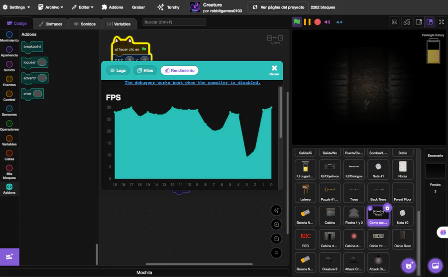 Por cierto, los bloques azules claros y el contador de FPS NO es una extensión, es una configuración que CodeTorch te ofrece, y me gustó mucho... Por fin puedo anunciar que RabGamesStudio trabajará ahora con CodeTorch.