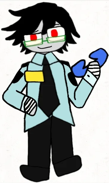 ya know, that AU that became a reason why humanized anime/gijinka versions of FNaF animatronics became so popular in 2015-2016). You may also know this design from Sky the Nightguard's "FNaF: New Nightguard" series, where Scott/Phone Guy looked exactly the same. In that series, Scott even had the same grey skin & red eyes.His "phone-head" being blue is a reference to OG FNaF Phone Guy's/Ralph's icon in Ultimate Custom Night, where he's represented as a blue rotary phone's receiver. This also may or may not be a nod to Ralph