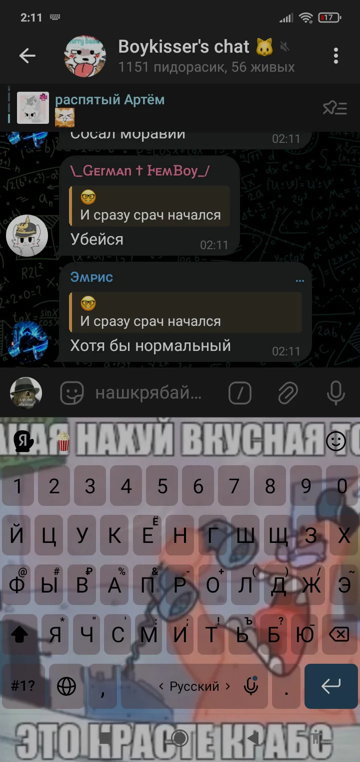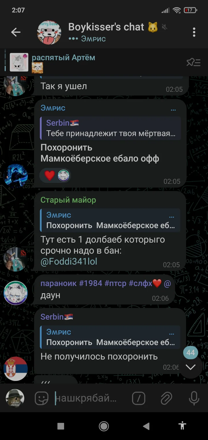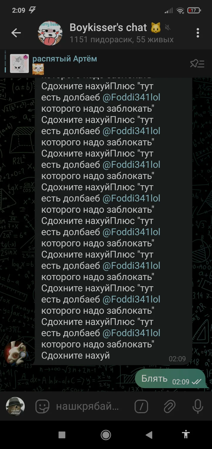 У нас в чате полный беспредел начался, все спамят "внимание чат", и "тут есть один долбоеб @[мой никнейм в тг] которого надо в бан"