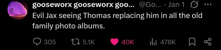 Thomas from the official jax song is replacing EVIL jax in the evil family photo album.