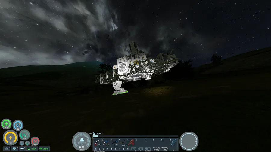 my first proper airborne vessel in Space Engineers survival mode, an atmospheric scavenger craft powered by dual hydrogen engines with an onboard refinery, assembler, radar, and ore detector