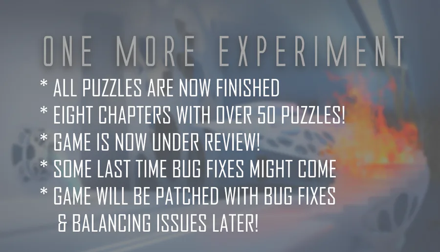 The full game of One More Experiment has now been submitted to be reviewed by Steamworks. The only thing left to be done is now: * 2 More puzzles * Steam Achievements * Trailer * Lots of playtesting RELEASE 25 NOVEMBER #OneMoreExperiment_game