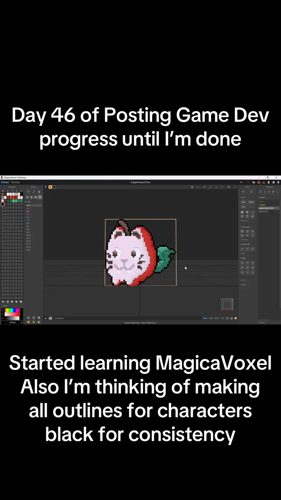 This was so much easier than I thought it would be. Also thoughts on solid black for all characters outlines? #Day46 #gamedev #MagicaVoxel