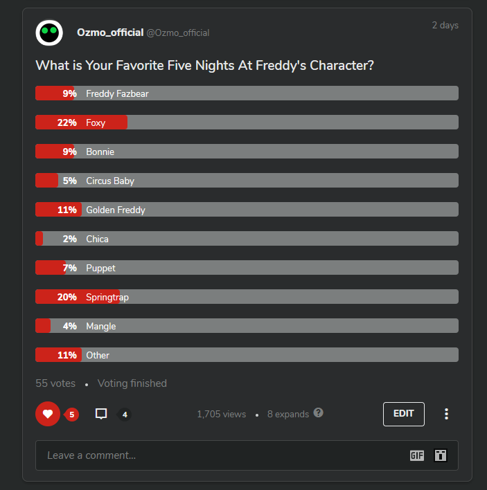 Day before Yesterday I organized a poll, asking your favorite FNAF character and the victory goes to foxy however I am astonished that Springtrap made it very close to him.(Yeah coz my poll got only 55 votes.)
