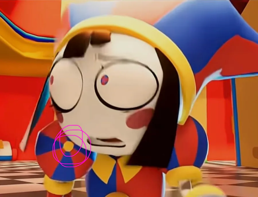 I thought Pomni’s design was changed, but she always had yellow dots at the top of her sleeve thingies?! I don’t recall seeing that EVER. I hadn’t noticed it until episode 8 💔