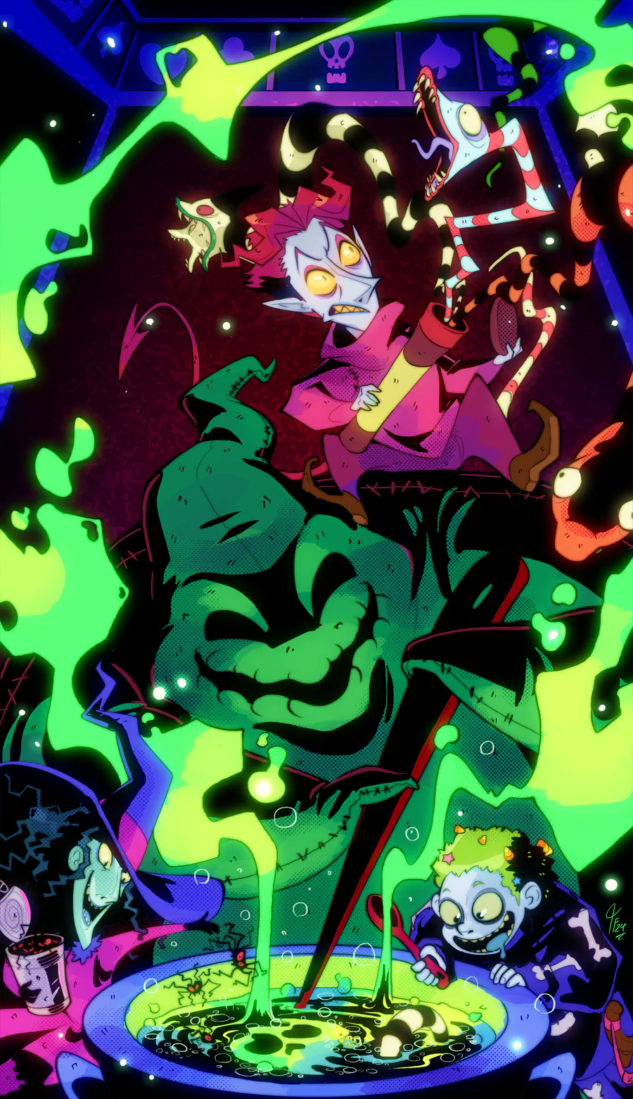 Pumpdina: Look What We Have Here In Halloween Town, Oogie Boogie And His Henchmen Lock, Shock And Barrel Trying To Make A Special Batch Of Snake & Spider Stew, With Shock & Barrel Putting In The Spider In The Stew, While Lock Having An Hard Time Getting The Snakes In The Only Thing Missing is.... An Rollie Polly Sandy Claws To Add A Little Spice~