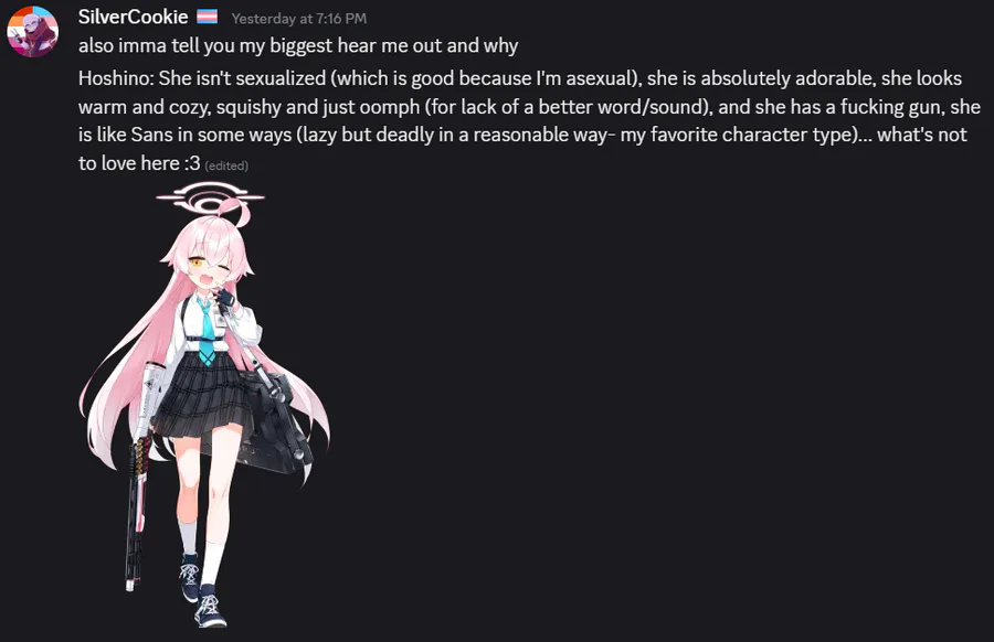 I dont know if i yapped to much or not- and yes, my hear me out (for lack of a better statement) is Hoshino from Blue Archive, a game I have NEVER played in my life but STILL, that's besides the point!
