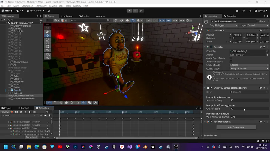 The lightest animations remained: aggression and screamer. I checked the running animation when working with AI, everything works. Just a little more, and Chica will be activated after Bonnie.