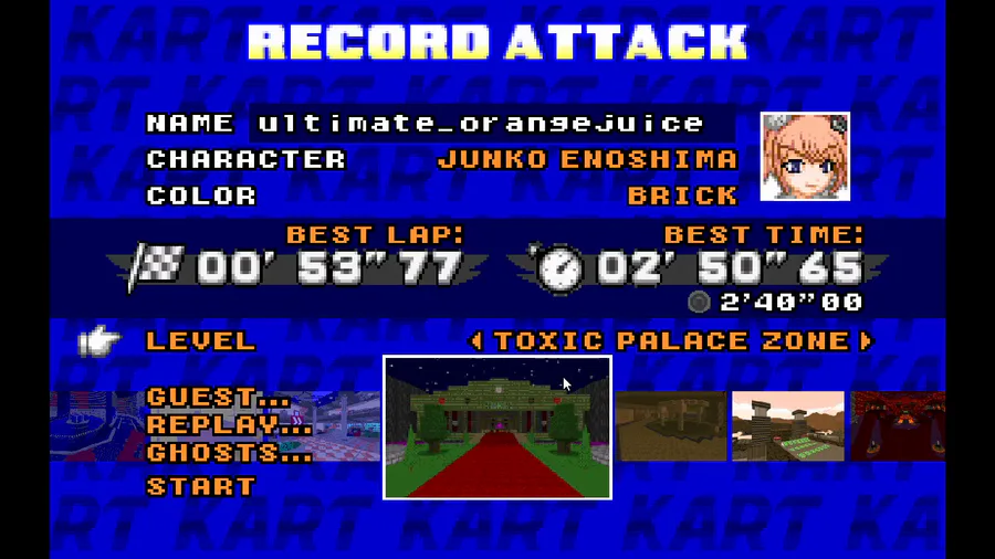 some srb2kart Junko Enoshima gameplay on the map Toxic Palace. I didn't do great, but I didn't do bad either.