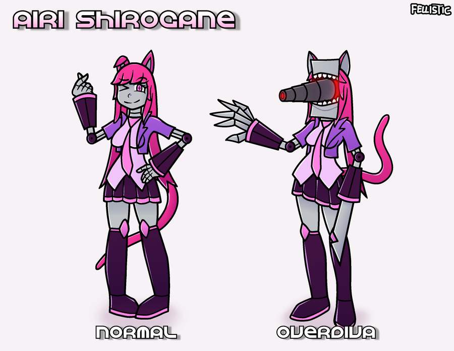 Airi Shirogane is a feline idol robot with two modes: a gentle, charismatic NORMAL form and an unstable OVERDIVA form that twists her sweetness into chaotic intensity.